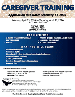 CIMC Elders Program Overview: The California Indian Manpower Consortium, Inc. (CIMC) administers six grants funded through the U.S. Department of Health and Human Services, Administration on Community Living/Administration on Aging. The grants for the Elders Program are authorized in Title VI of the Older Americans Act. |